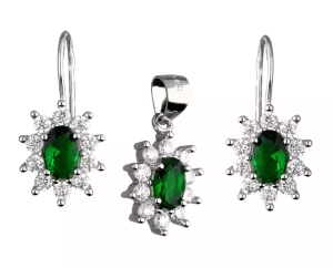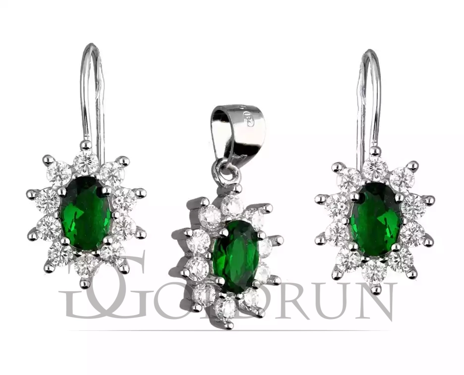 Komplet srebrnej biżuterii kolczyki + zawieszka, centralna cyrkonia - szmaragd