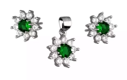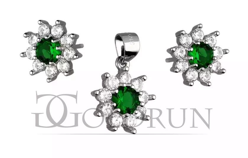 Komplet srebrnej biżuterii kolczyki + zawieszka, kwiatek, szmaragdowa cyrkonia