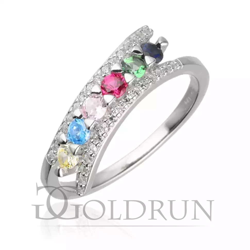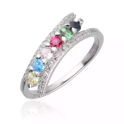 Pierścionek srebrny z kolorowymi kamieniami na środku i białymi po bokach