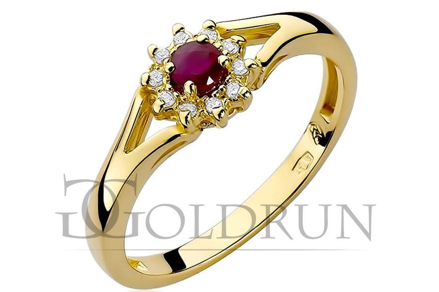 Pierścionek zaręczynowy z żółtego złota z rubinem i diamentami 0,09ct Fire Of Love